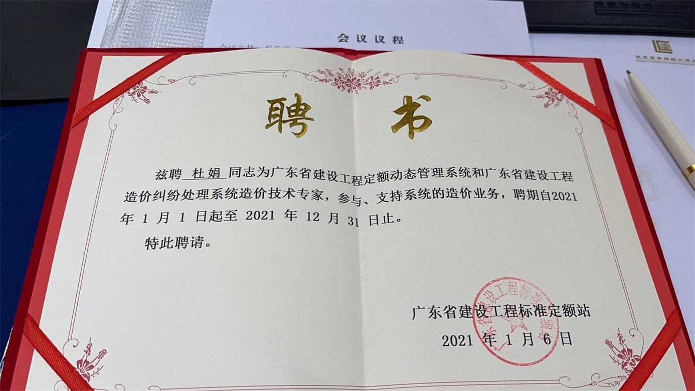 2021年11月24日下午,我司总经理杜娟女士参加广东省建设工程造价纠纷处理系统定额动态管理系统年度总结会议并收获聘书。