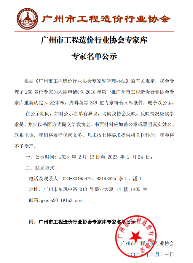 恭喜我司杜娟女士和周卓先生入选广州市工程造价行业协会专家库