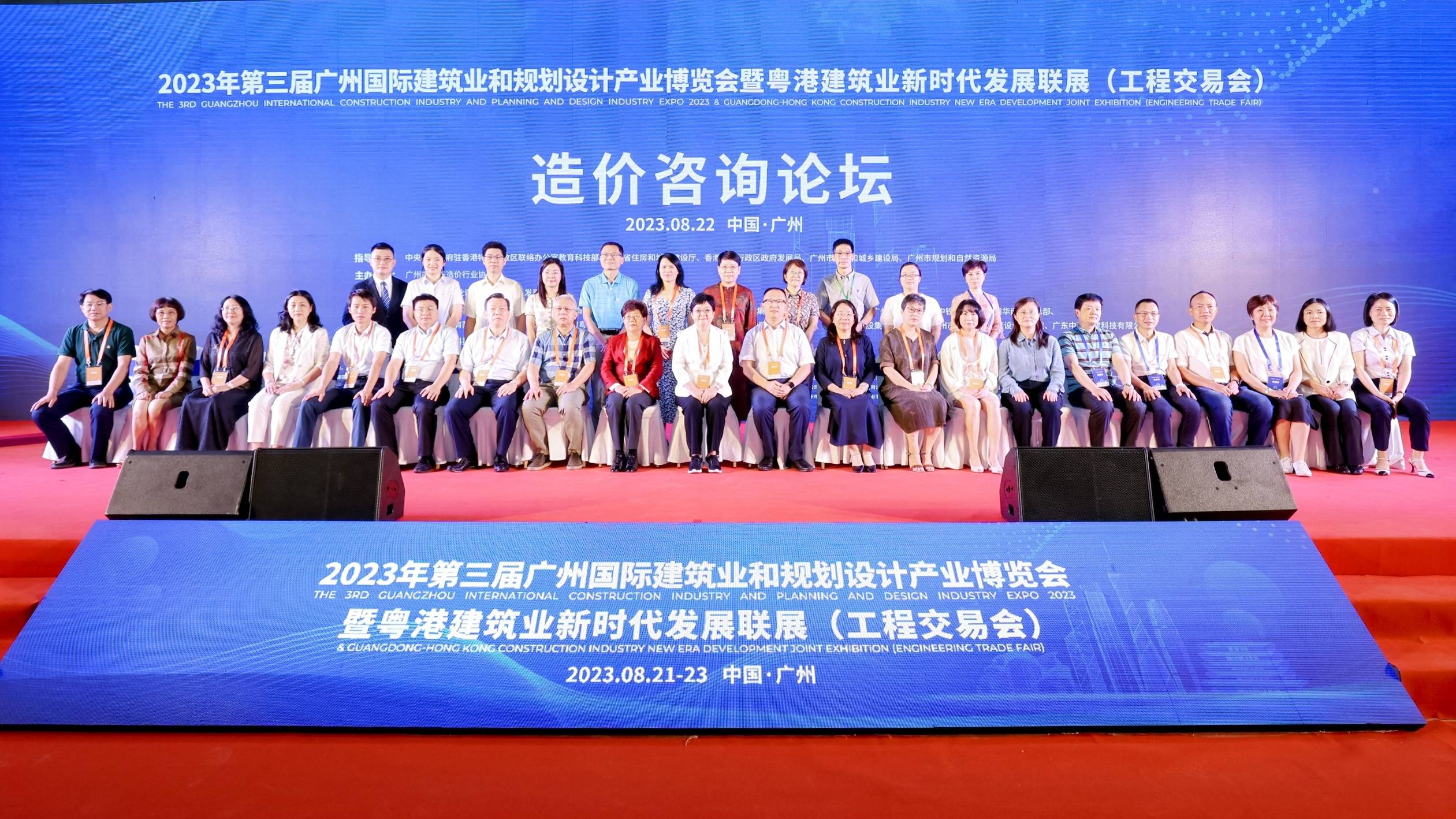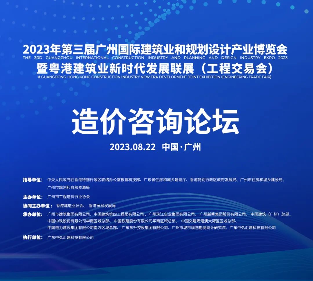 2023年8月22日上午,由广州市建筑业联合会主办,广州市工程造价行业协会协办的“2023年第三届广州国际建筑业和规划设计产业博览会暨粤港建筑业新时代发展联展(工程交易会)——造价咨询分论坛”在广州市广交会展馆B 区9.1馆主会场圆满结束。