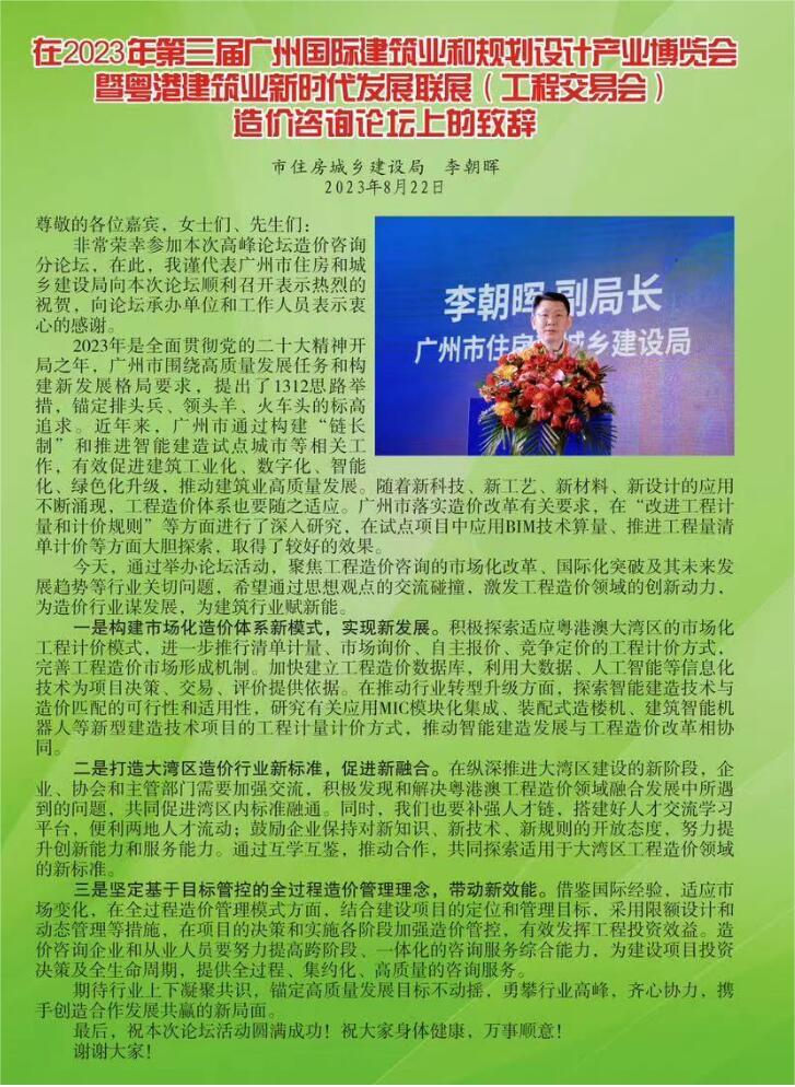 转发 ▏李朝晖副局长在2023年第三届广州国际建筑业和规划设计产业博览会暨粵港建筑业新时代发展联展(工程交易会》造价咨询论坛上的致辞